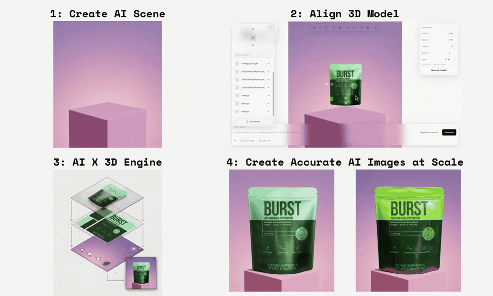 1. Create AI generated scene 2. Position 3D model 3. AI x 3D engine to maximise brand accuracy 4. Create unlimited visuals