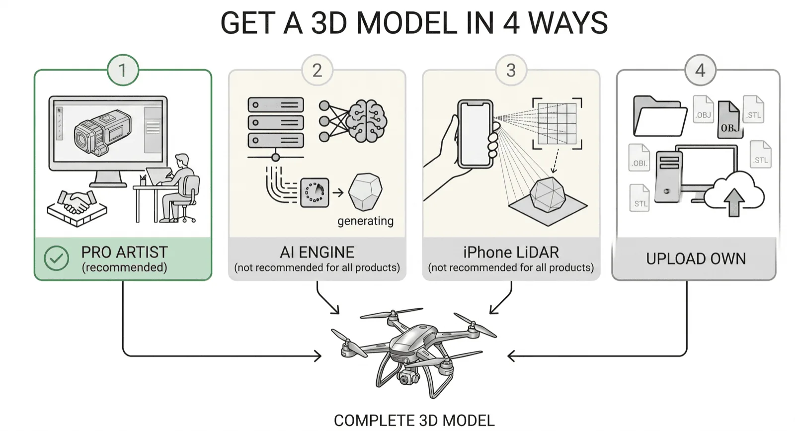 Option 1: Order a 3D model from a pro artist using our platform (recommended) Option 2: Generate one using our AI engine Option 3: Generate one using LiDAR on iPhone Option 4: Upload your own.